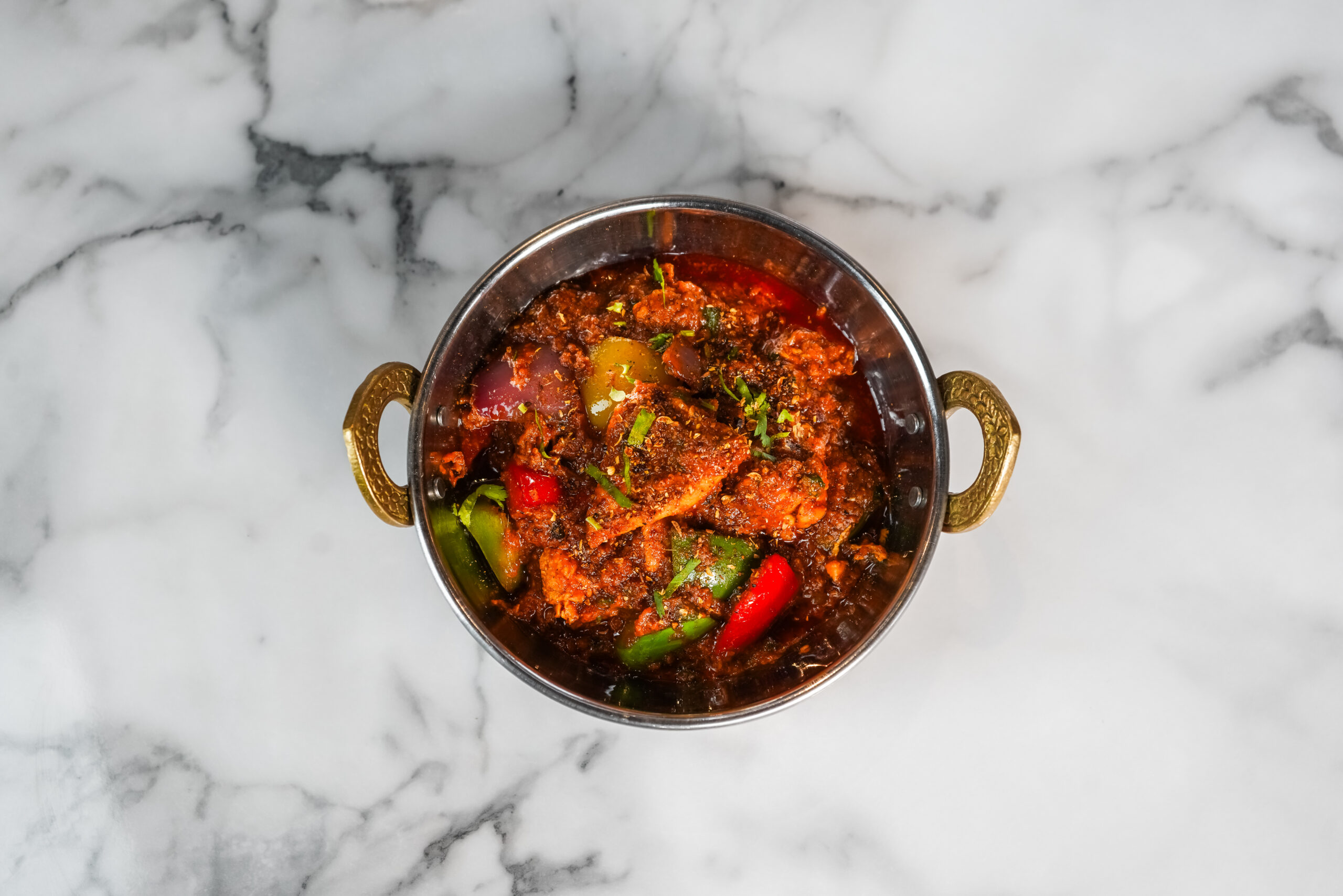 Chicken cooked in a spiced tomato gravy with bell peppers, onions and a blend of kadai masala.