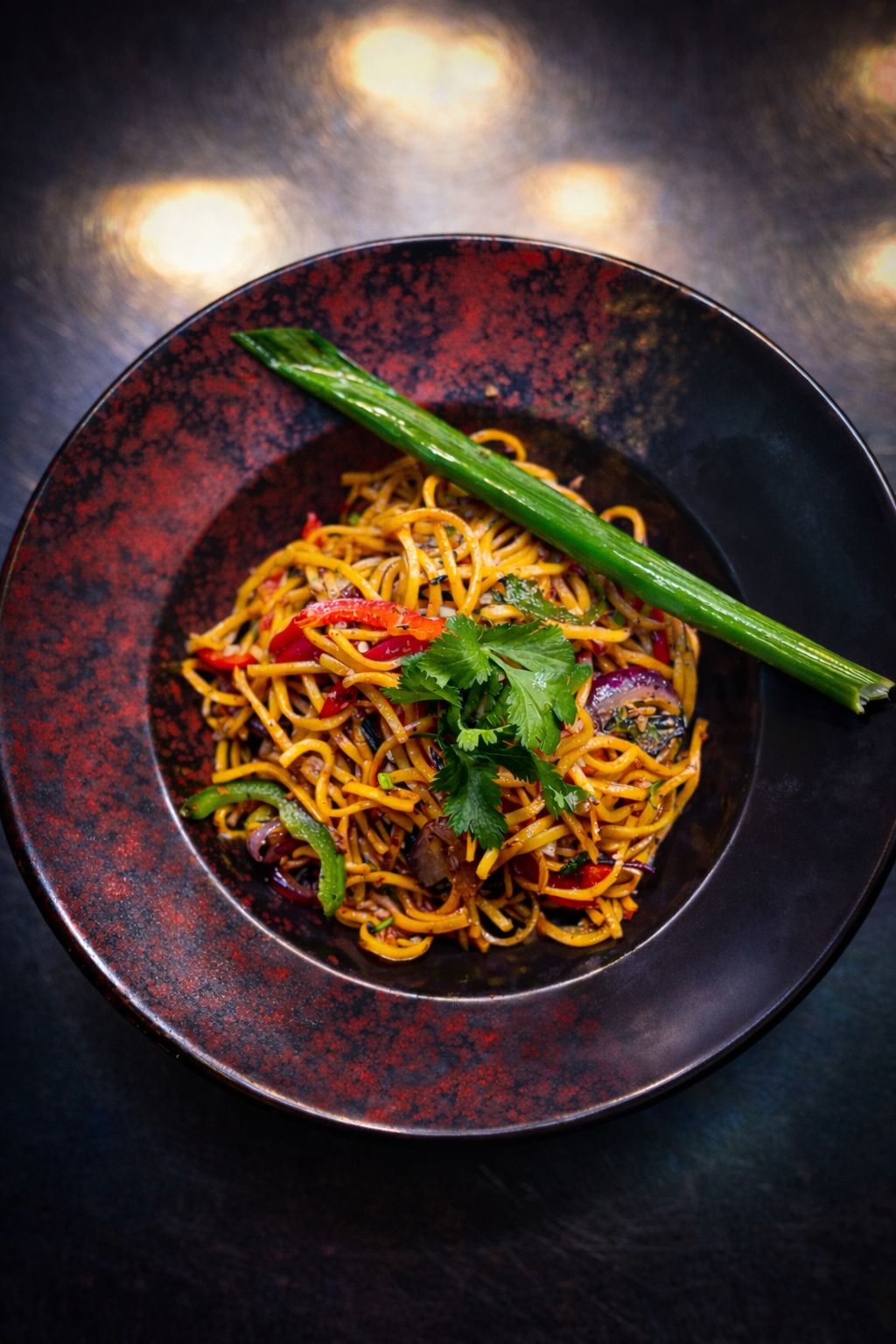 noodles are tossed with Thecha—a spicy Maharashtrian chutney made from Coriander,green chillies, garlic, and peanuts